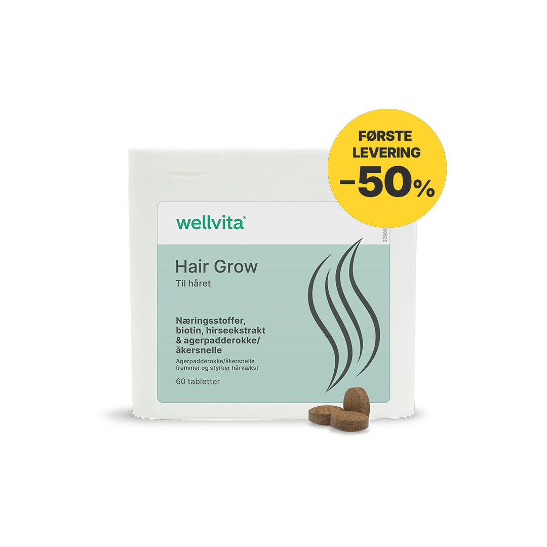 Hair Grow indeholder agerpadderokke, som kan fremme og styrke hårvæksten, og biotin og zink som kan bidrage med at vedligeholde et normalt hår og en normal hud.