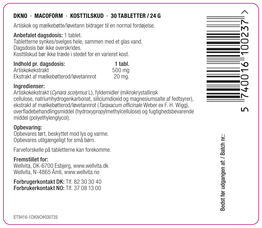 Macoform er baseret på artiskokekstrakt, der understøtter leverens afgiftende funktion. Artiskok afhjælper oppustethed og flatulens, fremmer vægttab, og kan desuden afhjælpe fordøjelsesproblemer bl.a. ved at fremme produktionen af fordøjelsessaft (galde og andre væsker, man producerer naturligt under fordøjelsen). Indeholder også ekstrakt fra mælkebøtte, som medvirker til at opretholde pH-balancen samt til en normal mave- og leverfunktion.