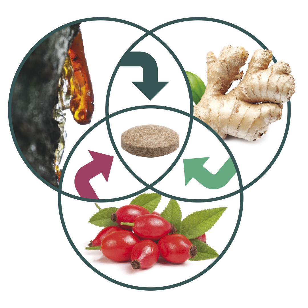 Ingefær i Movizin Complex hjælper med at bevare leddenes bevægelighed og afhjælper stivhed i kroppens led, hyben bidrager til leddenes udholdenhed og styrke og udtræk fra Boswellia-træets harpiks bidrager yderligere til at smøre leddene.